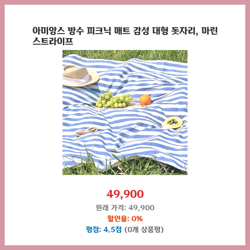 넉넉한 크기와 예쁜 마린 스트라이프 디자인에 끌렸습니다. 방수 기능도 있어 잔디밭이나 습한 곳에서도 사용하기 편리할 것 같아 구매했습니다. 두꺼운 편이라 땅의 차가움도 덜 느껴질 것 같습니다.