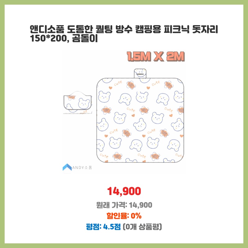 앤디소품 도톰한 퀄팅 방수 캠핑용 피크닉 돗자리 150*200, 곰돌이