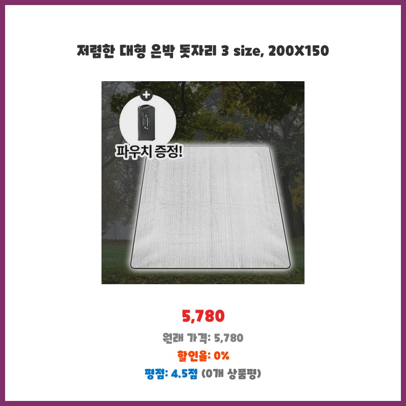 넓은 공간이 필요한 피크닉이나 야외 활동에 적합한 크기(200x150cm)에 가격도 저렴해서 부담 없이 구매했습니다. 은박 소재라 햇빛 반사 효과도 기대됩니다. 세 가지 사이즈 중 선택 가능한 점도 좋았습니다.
