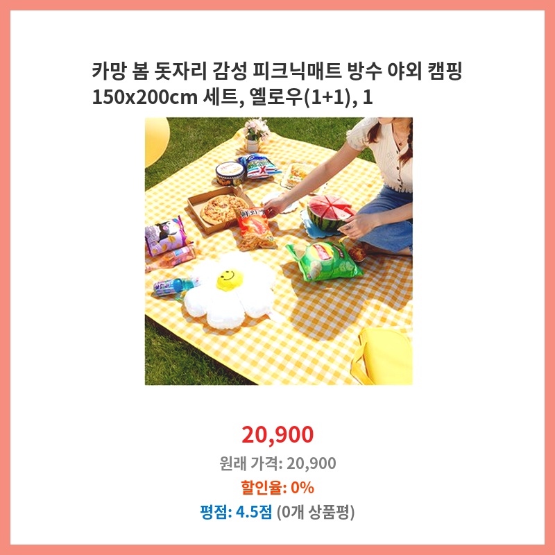 넉넉한 사이즈(150x200cm)에 1+1 구성이라 가성비가 좋았습니다. 봄 피크닉에 딱 맞는 밝은 옐로우 색상도 마음에 들었고, 방수 기능까지 있어 걱정 없이 사용할 수 있을 것 같아 구매했습니다.
