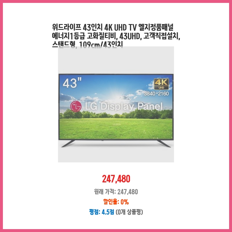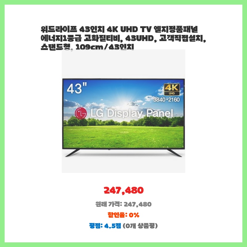 4K UHD 화질과 LG 정품 패널이라는 점이 마음에 들었습니다. 에너지 효율도 1등급이라 전기료 부담도 덜할 것 같아요. 합리적인 가격에 43인치 크기라 거실에 두고 사용하기에 적당합니다. 고객 직접 설치라 편리할 것 같았습니다.