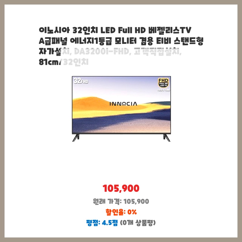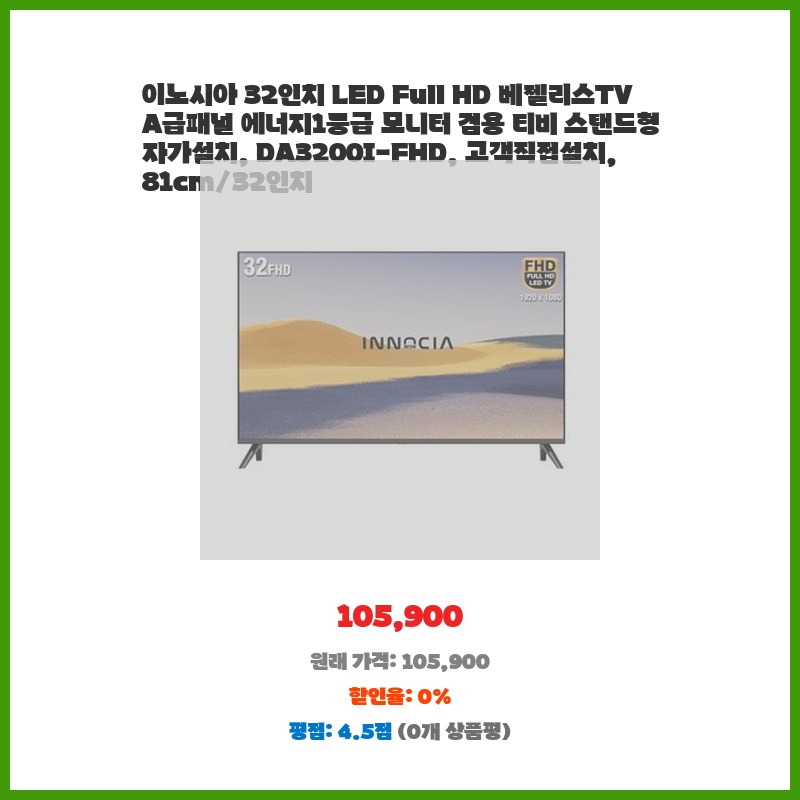 32인치 Full HD에 베젤리스 디자인이라 공간 활용도가 높고, 모니터 겸용으로 활용 가능해 가성비가 좋다고 판단했습니다. 에너지 효율 1등급이라 전기세 걱정도 덜어서 만족스럽습니다. 자가설치라 편리할 것 같아 선택했습니다.