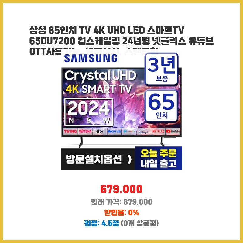 간편 결제 삼성 65인치 TV 4K UHD LED 스마트TV 65DU7200 업스케일링 OTT사용가능 놓칠 수 없는 선택