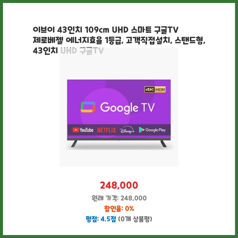 이브이 43인치 109cm UHD 스마트 구글TV 제로베젤 에너지효율 1등급, 고객직접설치, 스탠드형, 43인치 UHD 구글TV