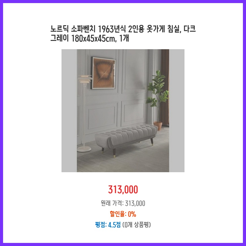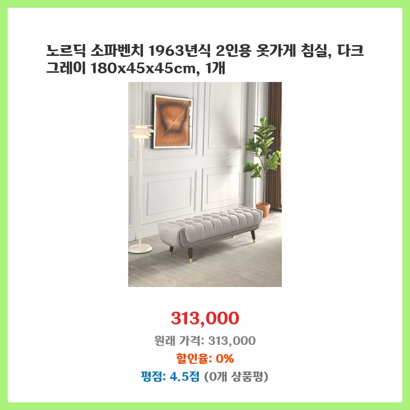 빈티지한 디자인과 넉넉한 사이즈가 마음에 들었습니다. 옷가게 피팅룸이나 침실 벤치로 활용하기에 적절한 크기이고, 다크 그레이 색상이 공간에 잘 어울릴 것 같아 구매했습니다. 1963년식이라는 점도 매력적이었습니다.