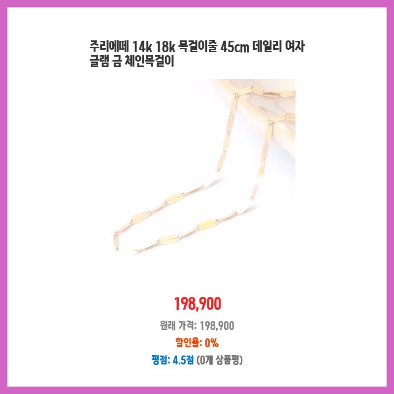 데일리 목걸이를 찾던 중 14k18k 고급 소재에 45cm 길이로 활용도가 높아 구매했습니다. 심플한 디자인이라 어떤 옷에도 잘 어울리고, 착용감도 편안합니다. 금 체인이라 관리도 용이할 것 같아 만족스럽습니다.