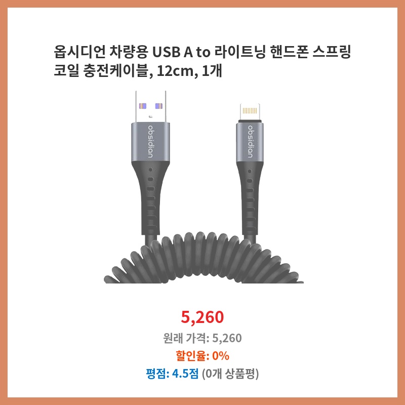 차량용 충전기가 필요했고, 15W 고속 충전과 튼튼한 스프링 코일이 마음에 들었습니다. USB A 타입이라 호환성도 좋고, 라이트닝 케이블이라 아이폰 충전에 편리할 것 같아 구매했습니다.