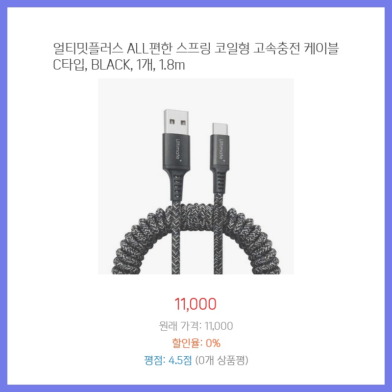 고속 충전이 필요해서 C타입 케이블을 찾던 중, 1.8m의 넉넉한 길이와 스프링 코일 형태로 꼬임 방지 및 휴대성이 좋아 보여 구매했습니다. ALL편한이라는 이름처럼 편리함을 중시했고, 가격 대비 품질이 괜찮아 보였습니다.
