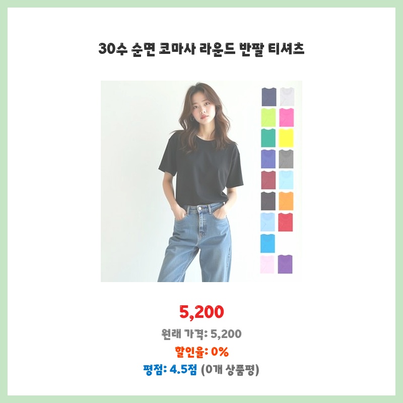 부드러운 착용감과 5,200원이라는 저렴한 가격이 매력적이었습니다. 30수 순면 코마사 소재라 땀 흡수도 잘 되고, 여름에 입기 좋을 것 같아 구매했습니다. 일상복으로 편하게 입을 수 있는 기본 디자인도 마음에 들었습니다.