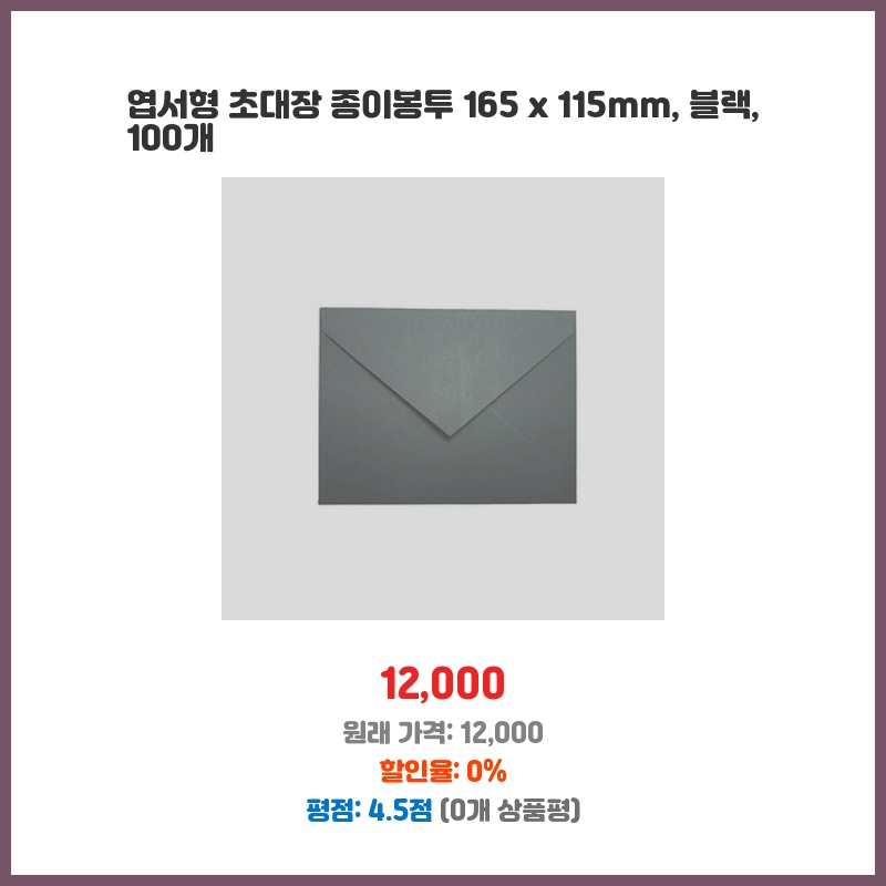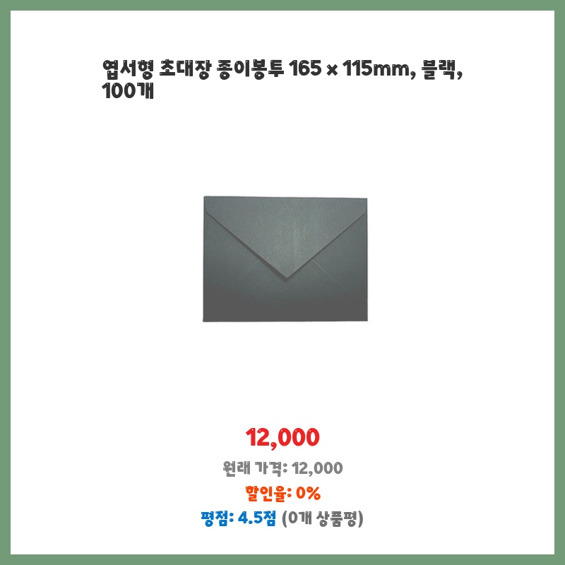 깔끔한 블랙 색상과 적당한 크기(165x115mm)의 엽서형 초대장 봉투가 100개나 들어있어 가성비가 좋습니다. 행사에 필요한 봉투를 한꺼번에 준비할 수 있어 편리할 것 같아 구매했습니다. 고급스러운 느낌도 좋아 보입니다.