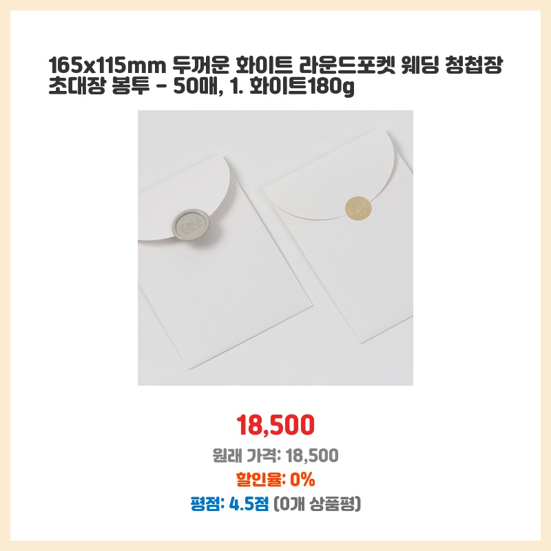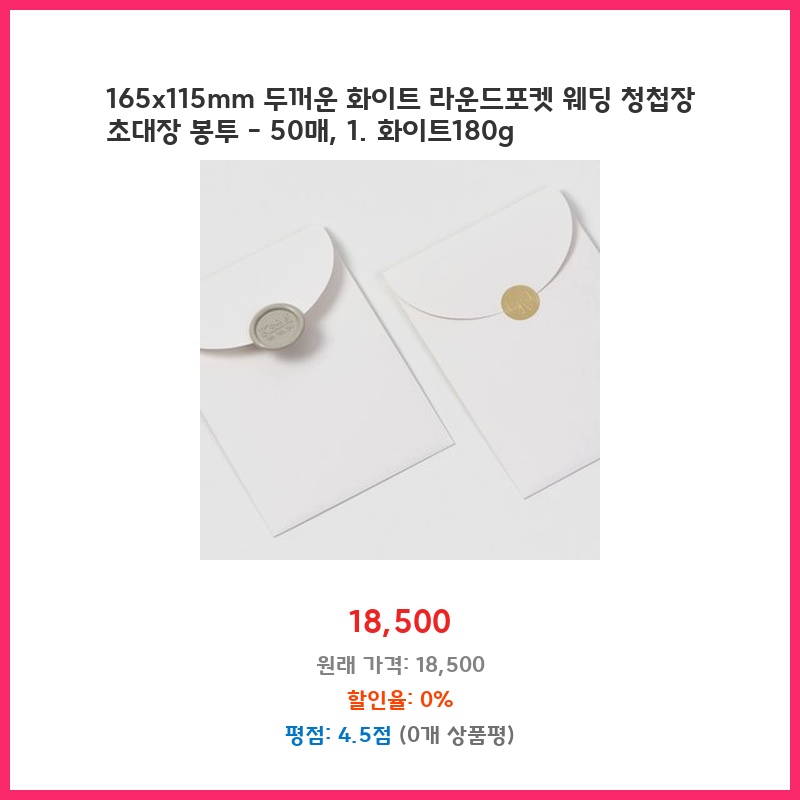 165x115mm 두꺼운 화이트 라운드포켓 웨딩 청첩장 초대장 봉투 - 50매, 1. 화이트180g