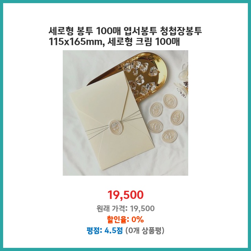 깔끔한 크림색에 100매나 들어있어 가성비가 좋습니다. 엽서와 청첩장에 모두 사용할 수 있는 표준 사이즈라 활용도가 높아 여러 용도로 편리하게 사용할 수 있을 것 같아 구매했습니다. 두꺼운 종이라 봉투의 품질도 좋아 보입니다.