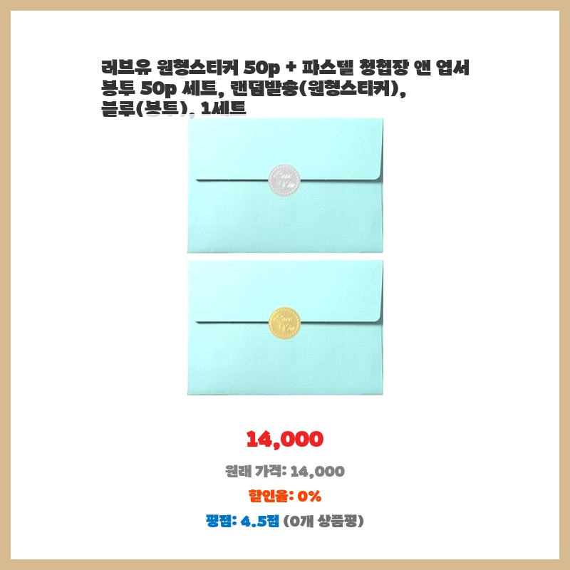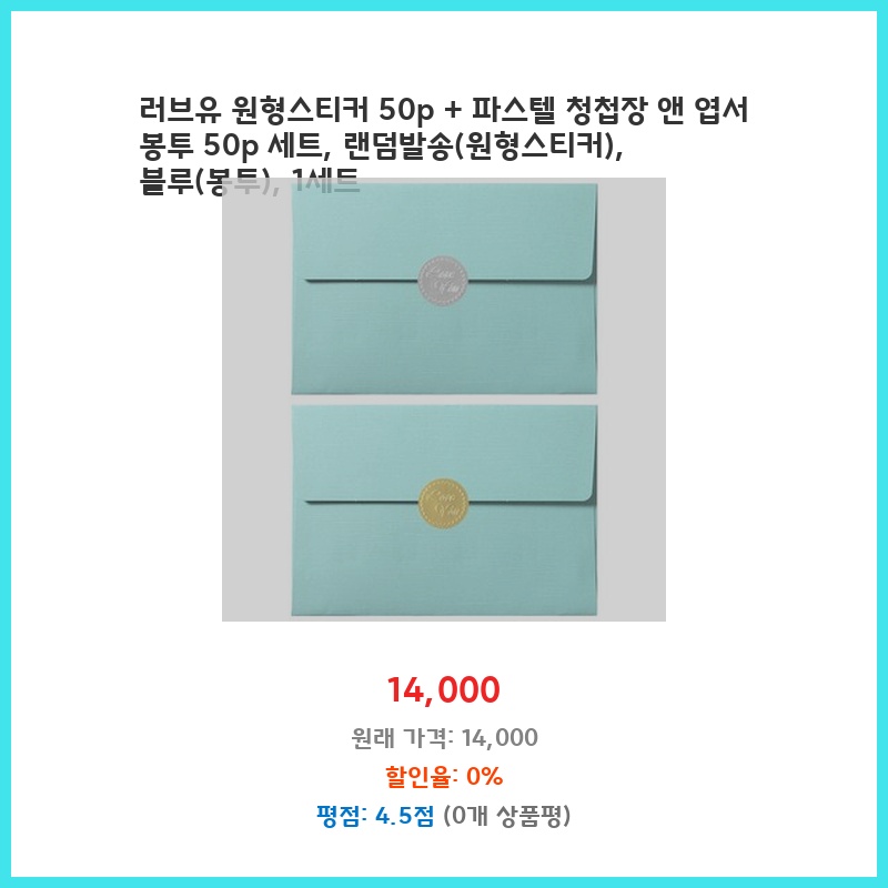 나만의 필수템 러브유 원형스티커 50p + 파스텔 청첩장 앤 엽서 봉투 50p 세트 랜덤발송 블루 1세트 바로 적용되는 혜택