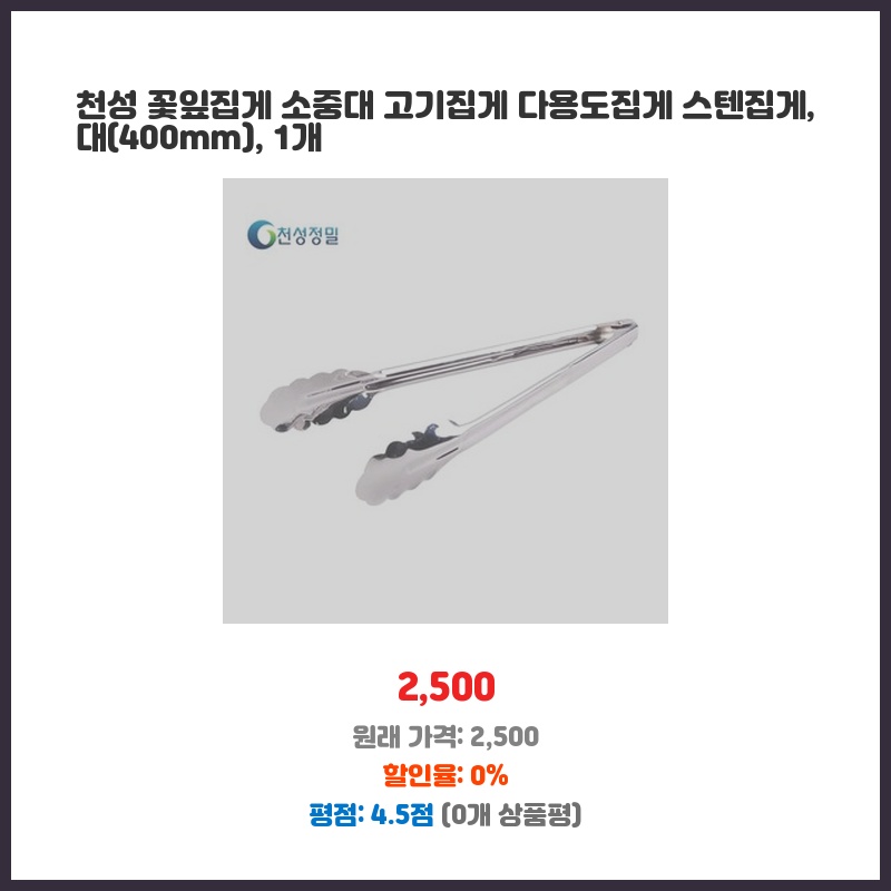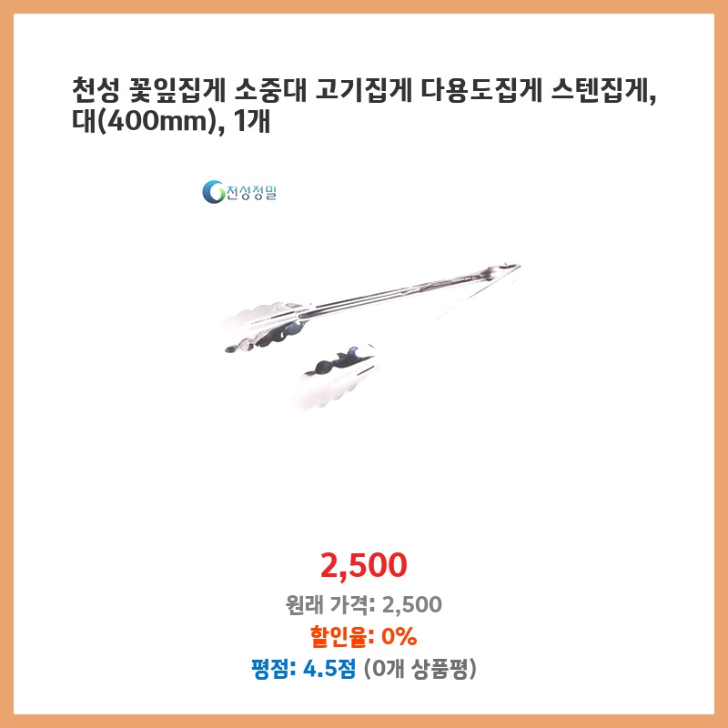 고기 굽는 집게가 필요했는데, 스테인리스 재질에 400mm 대형 사이즈라 고기 뒤집기가 편할 것 같아 구매했습니다. 가격도 저렴하고 다용도로 사용 가능하다는 점이 매력적이었습니다. 튼튼해 보이는 것도 장점입니다.