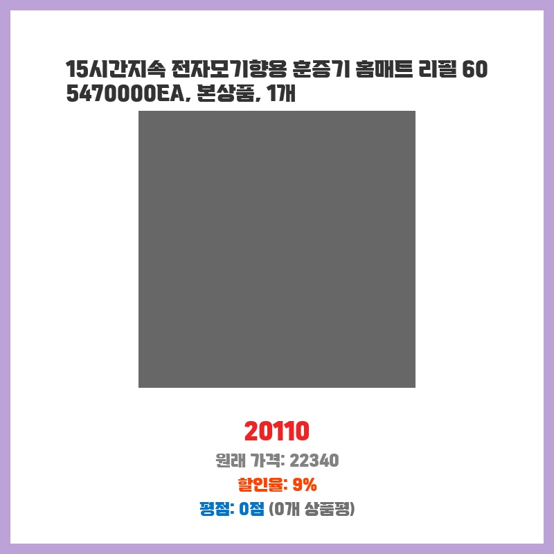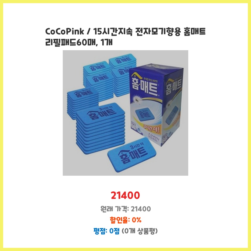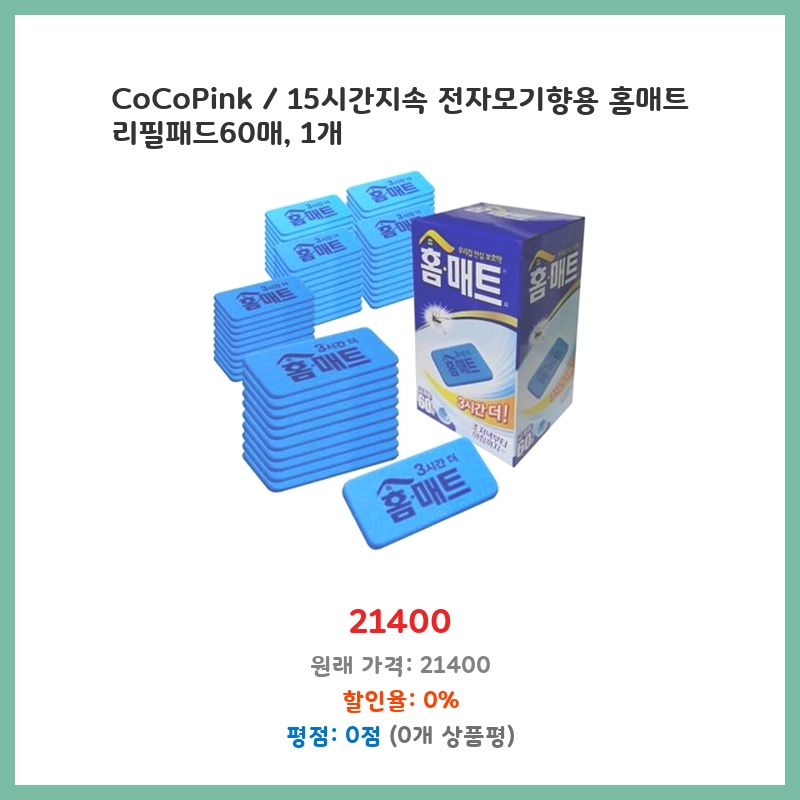 15시간 지속되는 긴 사용시간과 60매의 넉넉한 수량이 마음에 들어 구매했습니다. 여름철 모기 때문에 잠 못 이루는 일이 많았는데, 홈매트 리필이라 사용이 간편하고 효과적일 것 같아 선택했습니다. CoCoPink 제품이라 믿음직스러웠습니다.