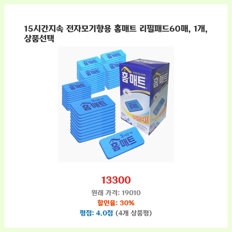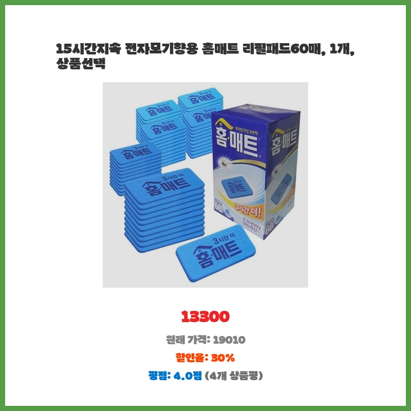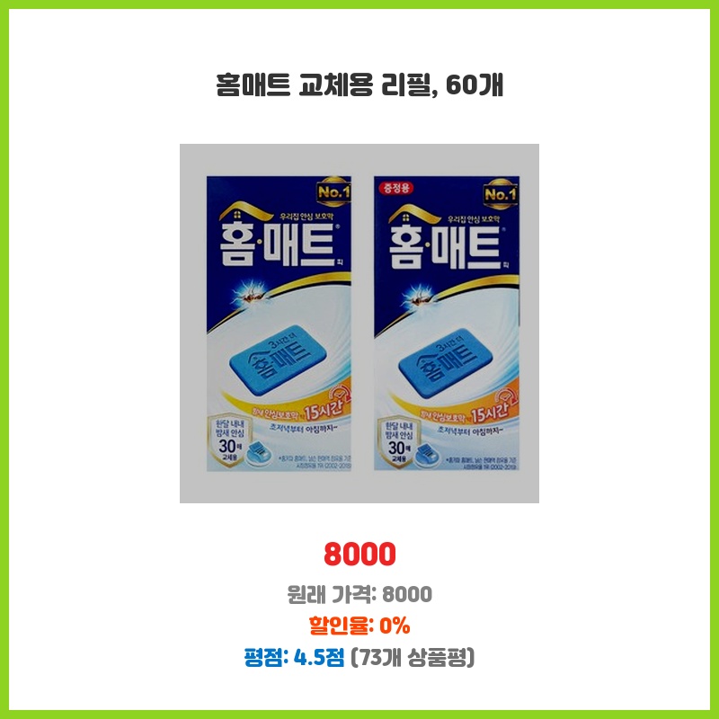 기존 홈매트 리필이 떨어져서 교체용으로 구매했습니다. 60개 대용량이라 오래 사용할 수 있고, 가격 대비 양이 많아 경제적입니다. 꾸준히 사용하는 제품이라 부담없이 구매했습니다.