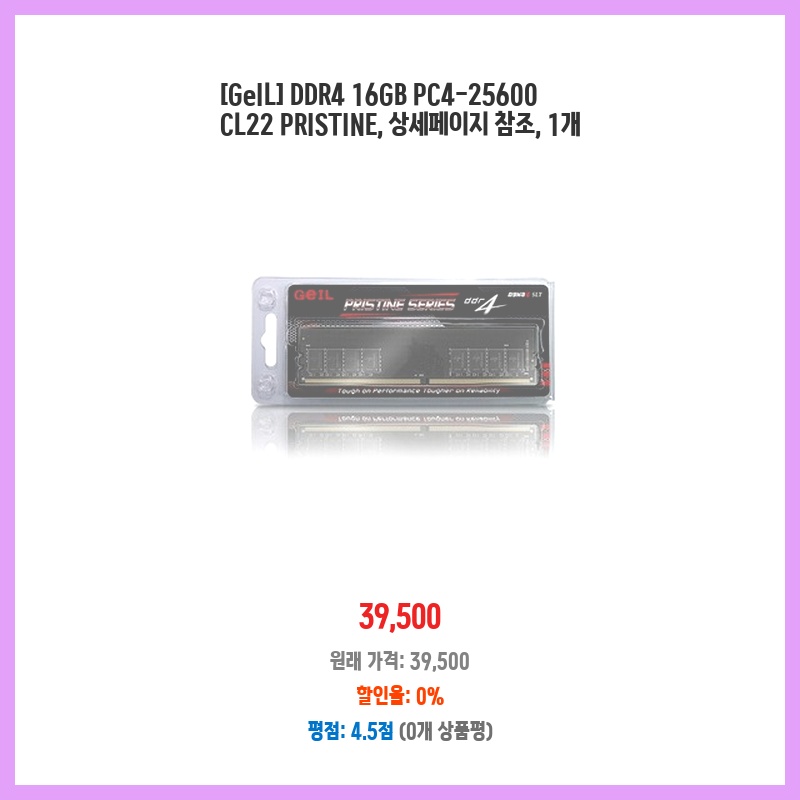 16GB 용량에 CL22의 낮은 레이턴시로 게임과 작업 모두 부드럽게 진행하고 싶어 구매했습니다. GeIL의 PRISTINE 시리즈는 품질도 괜찮다는 평이 많아 안정성을 고려했습니다. 가격 대비 성능이 뛰어나다고 판단했습니다.