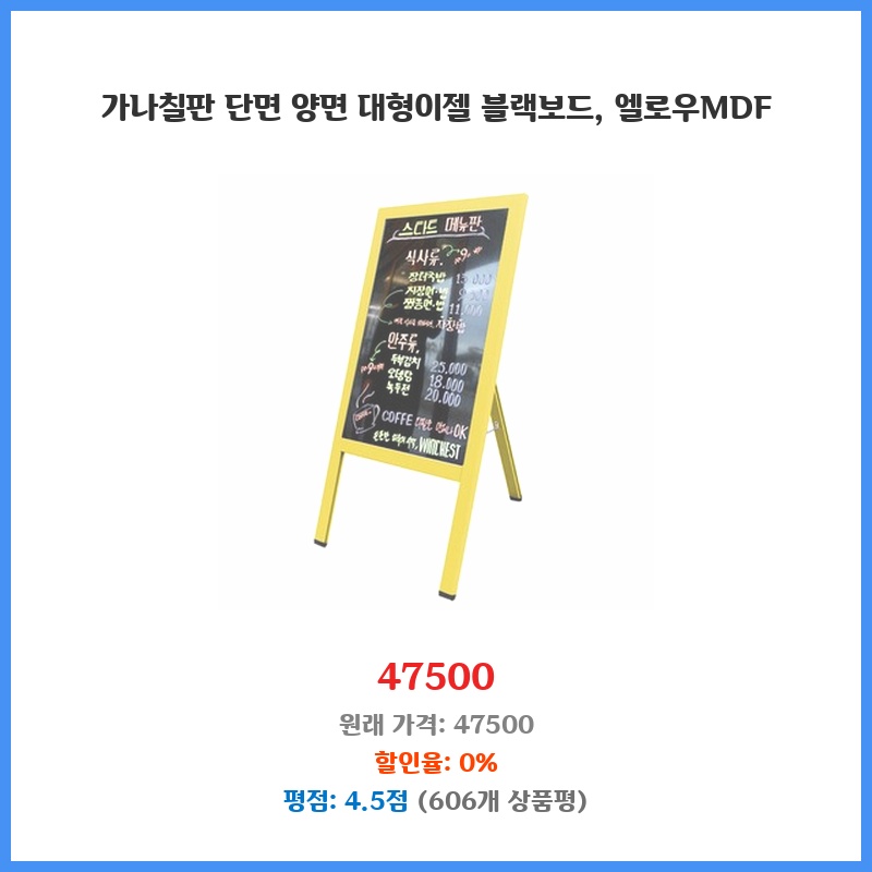 양면 사용이 가능하고 크기가 커서 아이들 미술 활동이나 학습용으로 활용하기에 좋을 것 같아 구매했습니다. 엘로우MDF 소재라 튼튼하고 깔끔한 디자인도 마음에 들었습니다. 가격 대비 만족스러운 크기와 기능입니다.