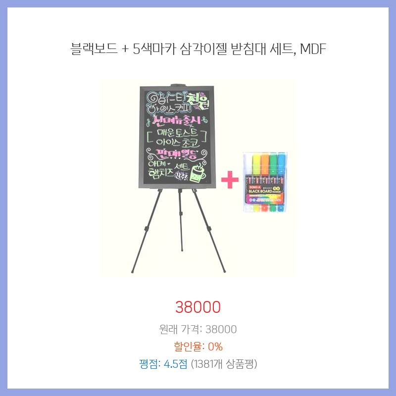 아이 방 학습 공간을 꾸미고 싶어서 구매했습니다. MDF 소재라 튼튼하고, 이젤 형태라 공간 활용도가 좋을 것 같았습니다. 5색 마카까지 포함되어 있어 따로 구매할 필요가 없어 편리했습니다.