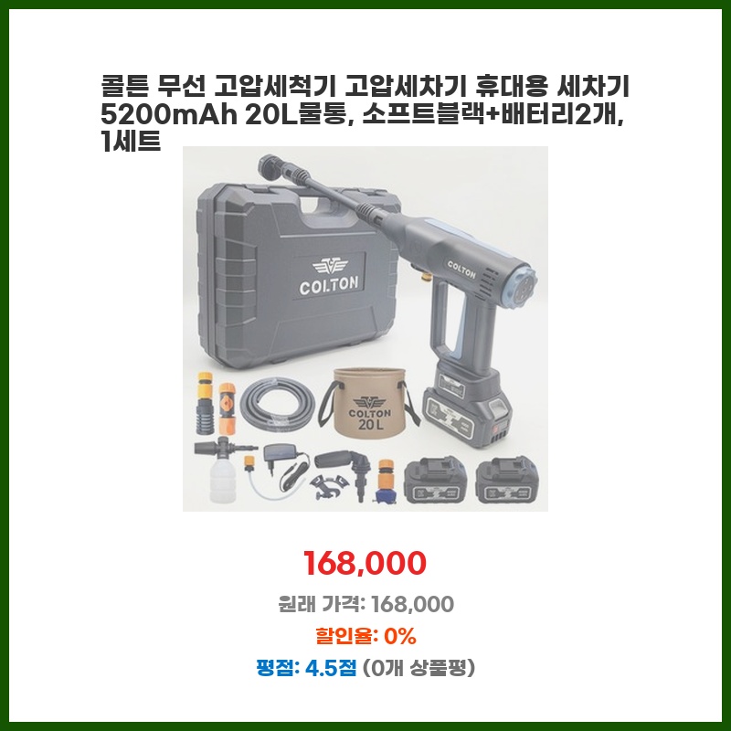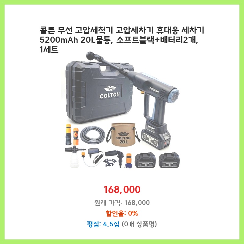 휴대성이 좋고 배터리 두 개라 오래 사용할 수 있어서 구매했습니다. 20L 물통 용량도 적당하고, 무선이라 코드에 제약받지 않아 편리할 것 같았습니다. 소형차 세차에도 충분할 것 같아 기대됩니다.