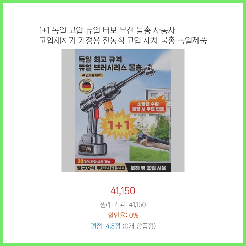 1+1 독일 고압 듀얼 터보 무선 물총 자동차 고압세차기 가정용 전동식 고압 세차 물총 독일제품