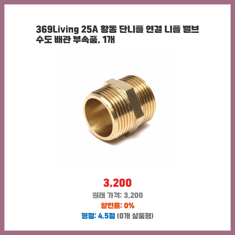 낡은 수도 배관 부속품을 교체해야 했는데, 369Living 제품이 황동 소재로 내구성이 좋아 보였고, 단순한 디자인이 마음에 들었습니다. 가격도 적당해서 구매했습니다.