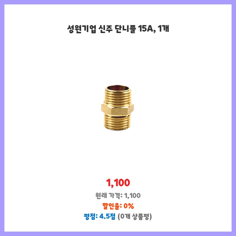 신주 단니플 15A 수도 배관자재 부속 파이프 설비 보일러 난방 황동, 1개