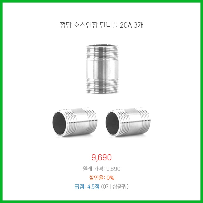 15A 스텐 단니플이 필요했는데, 가격이 저렴하고 1개만 필요해서 구매했습니다. 스테인리스 재질이라 내구성이 좋을 것으로 예상됩니다. 필요한 사이즈가 정확히 맞아서 좋았습니다.