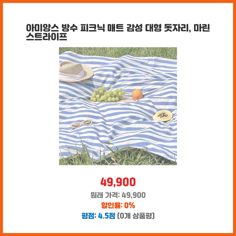 넉넉한 크기와 예쁜 마린 스트라이프 디자인에 끌렸습니다. 방수 기능도 있어 잔디밭이나 습한 곳에서도 사용하기 편리할 것 같아 구매했습니다. 두꺼운 편이라 땅의 차가움도 덜 느껴질 것 같습니다.