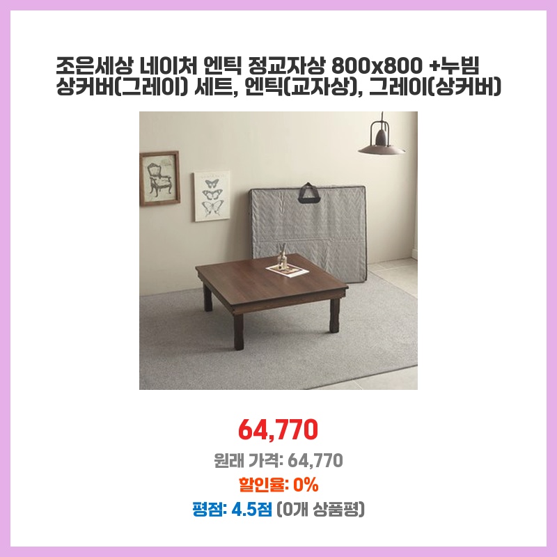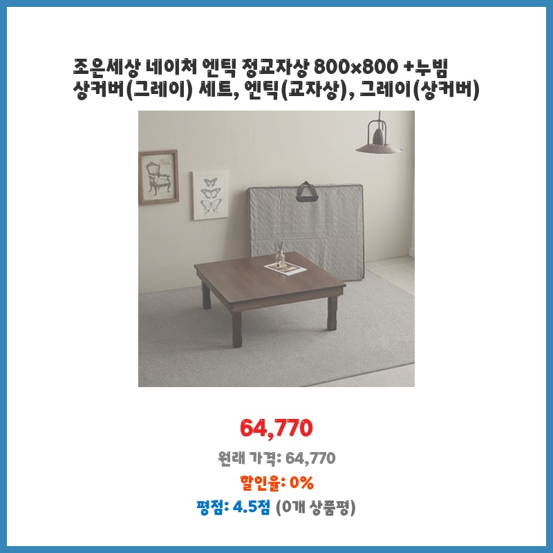 넓고 튼튼한 교자상이 필요했는데, 누빔 상커버까지 포함된 세트라 가성비가 좋았습니다. 엔틱 디자인도 마음에 들고, 그레이 색상도 무난해서 어떤 인테리어에도 잘 어울릴 것 같았습니다. 800x800 사이즈도 넉넉해서 사용하기 편할 것 같습니다.