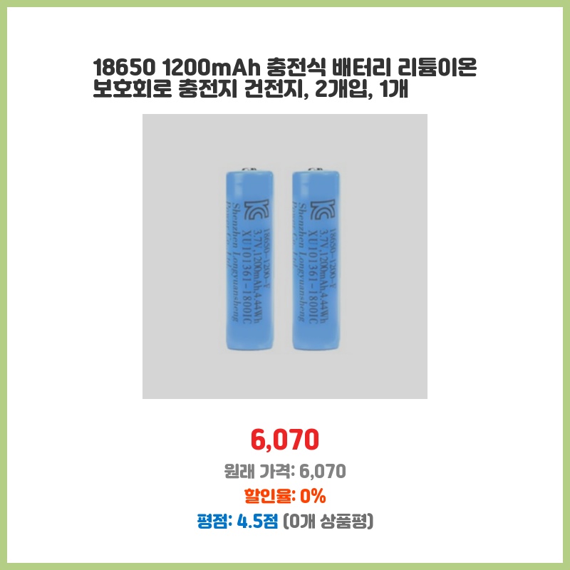 18650 1200mAh 충전식 배터리 리튬이온 보호회로 충전지 건전지, 2개입, 1개