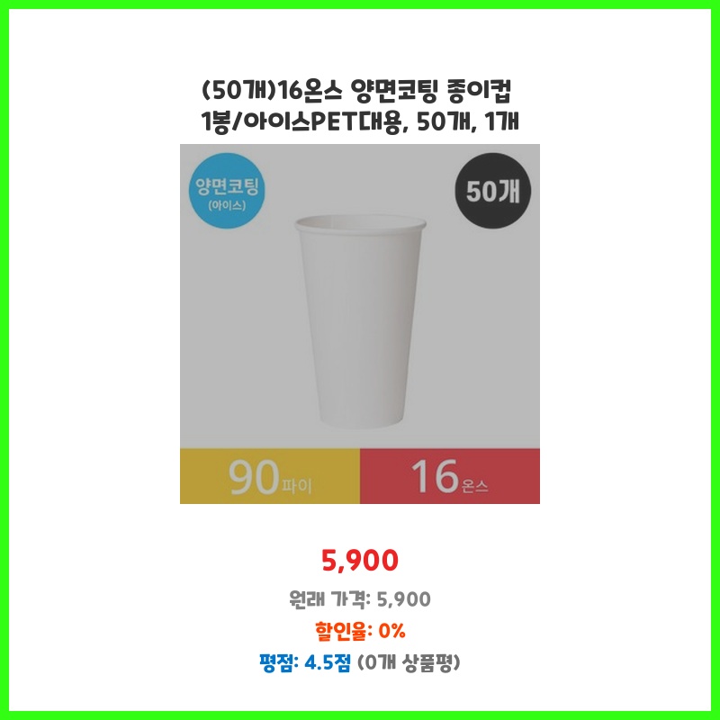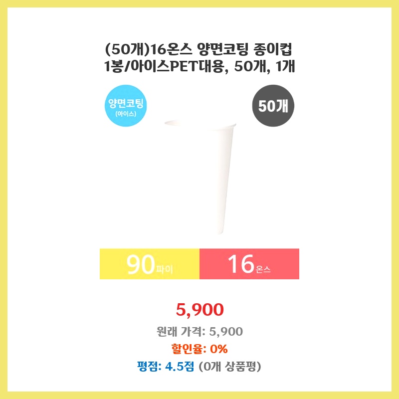 아이스 PET컵 대용으로 50개들이라 가성비가 좋습니다. 양면 코팅이라 내용물이 새지 않고, 16온스 용량이라 넉넉하게 사용할 수 있어요. 행사나 파티용으로도 적합해 보입니다.
