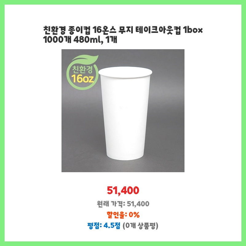 매장에서 사용할 친환경 종이컵이 필요했습니다. 1000개 대량 구매로 가격 효율이 좋고, 무지 디자인이라 우리 매장 로고를 인쇄해서 사용할 수 있어 좋습니다. 480ml 용량도 적당합니다.