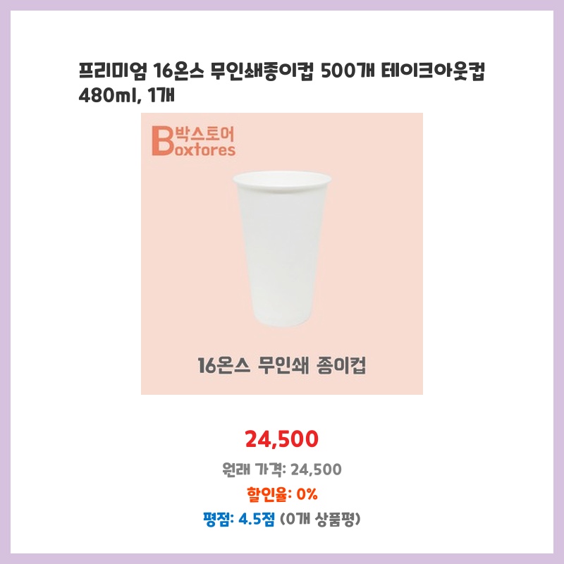 넉넉한 500개 수량에 16온스의 적절한 크기, 무인쇄라 깔끔하고 어떤 용도로든 사용 가능해서 매장 운영에 필요한 용품으로 구매했습니다. 가격 대비 양도 만족스러워요.