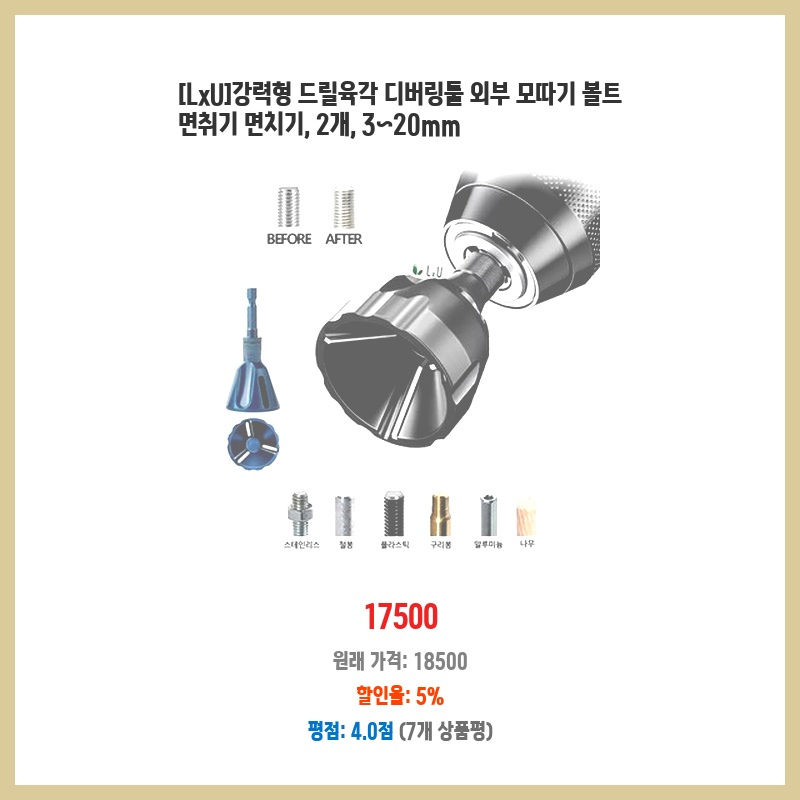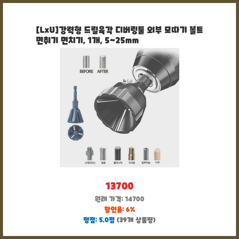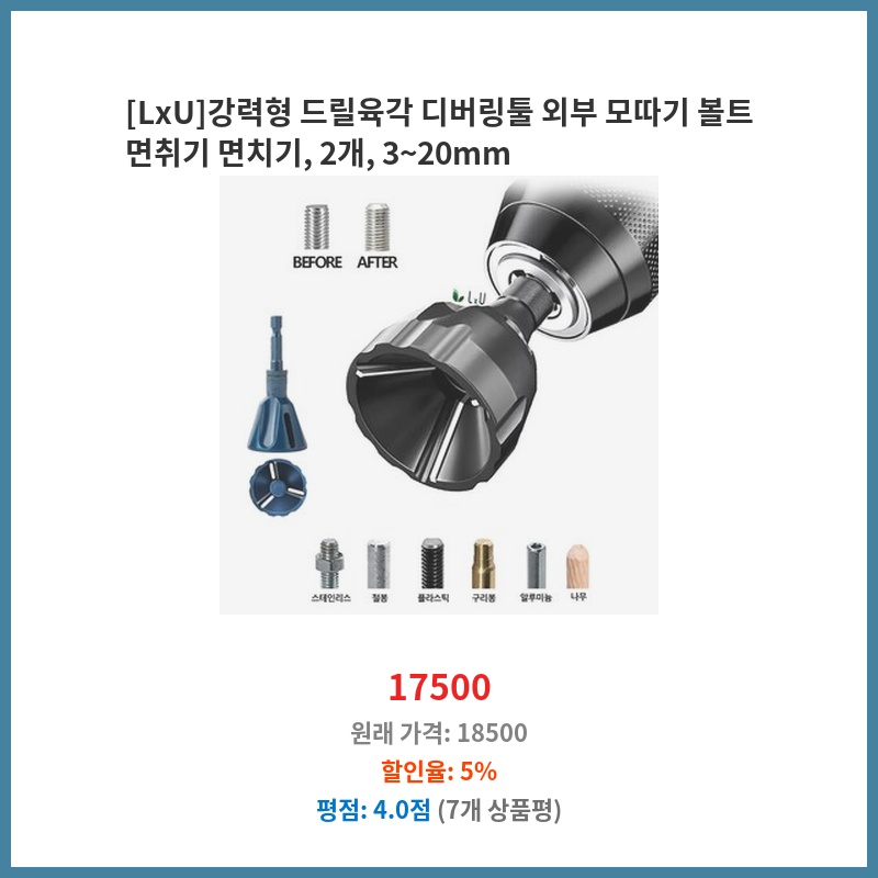 다양한 사이즈의 볼트 작업이 많은데, 기존 수동 면취기는 시간이 오래 걸리고 불편했습니다. LxU 강력형 드릴육각 디버링툴은 320mm까지 다양한 볼트에 사용 가능하고, 드릴에 장착하여 작업 속도를 높일 수 있어 구매했습니다. 시간 절약과 작업 효율 증대를 위해 선택했습니다.