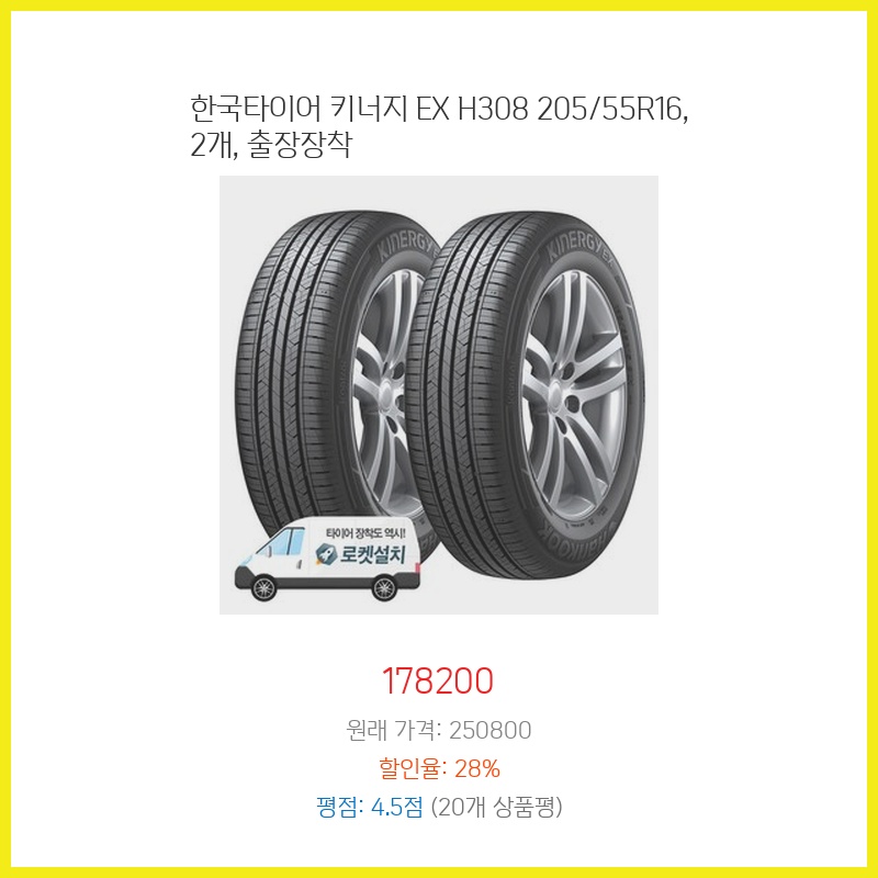 연비 효율과 승차감 개선을 위해 한국타이어 키너지 EX H308을 선택했습니다. 합리적인 가격에 출장 장착 서비스까지 제공되어 편리하게 교체할 수 있었던 점이 좋았습니다. 소음도 기존 타이어보다 덜한 편입니다.