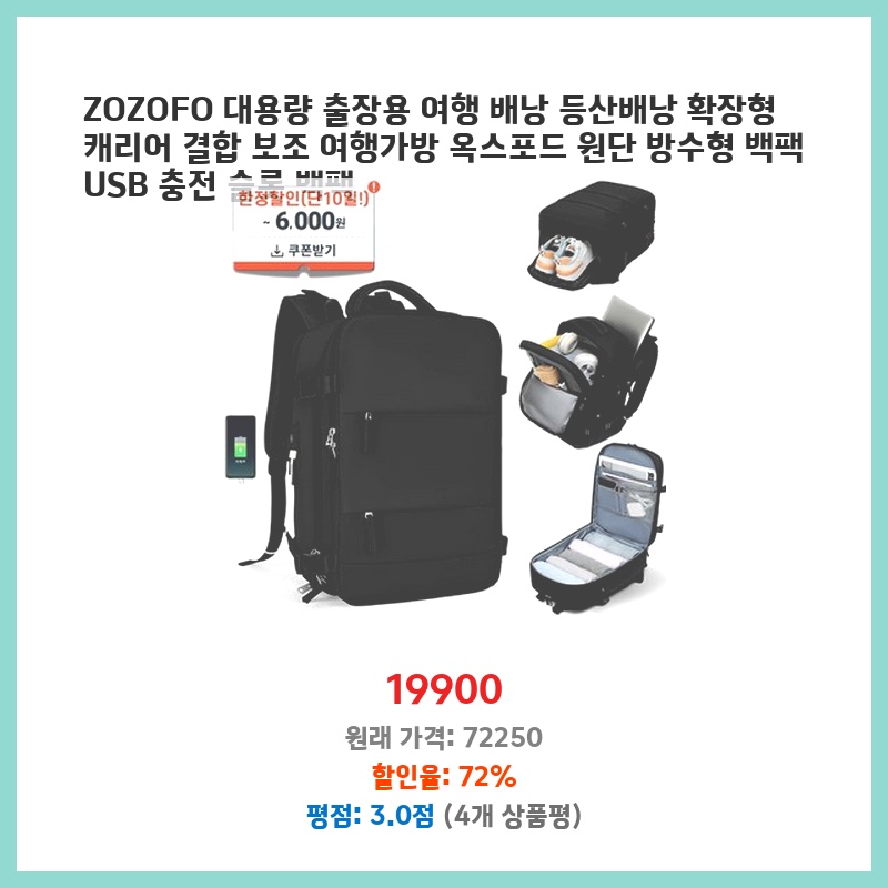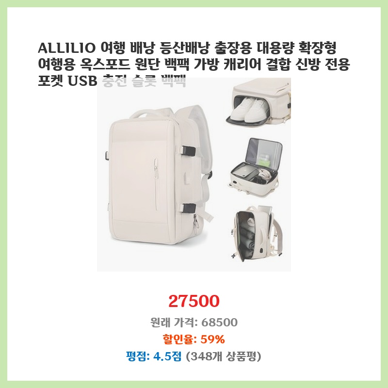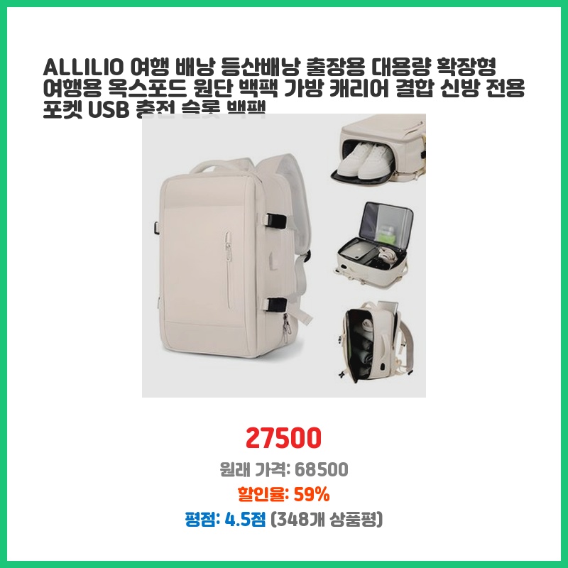 여행과 출장이 잦아 대용량 배낭이 필요했는데, 확장 기능과 캐리어 결합 기능이 마음에 들었습니다. USB 충전 포트도 편리하고, 옥스포드 원단이라 내구성도 좋아 보였습니다. 가격 대비 기능이 다양해서 구매했습니다.