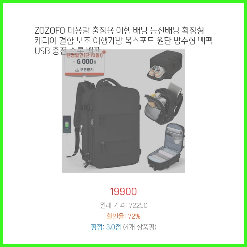 15000원이라는 저렴한 가격에 백팩, 토트, 숄더 3가지로 활용 가능하고, 넉넉한 수납공간과 방수 기능까지 갖춰 실용성이 높아 구매했습니다. 대용량이라 여행이나 일상 모두 사용하기 편리할 것 같았습니다.