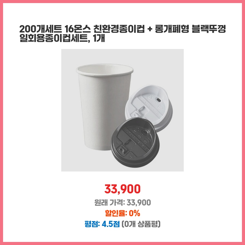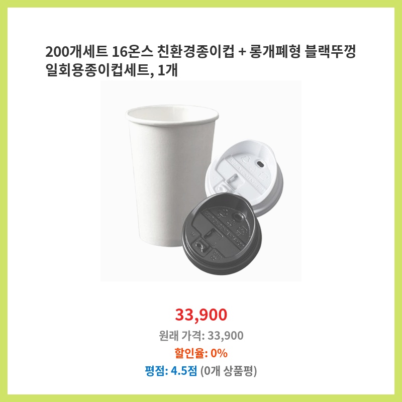 행사용으로 200개가 필요했는데, 친환경 종이컵에 뚜껑까지 포함된 세트라 편리했습니다. 16온스 용량도 충분하고, 블랙 뚜껑이 깔끔해서 만족스러워요. 가격 대비 양도 많아 경제적입니다.
