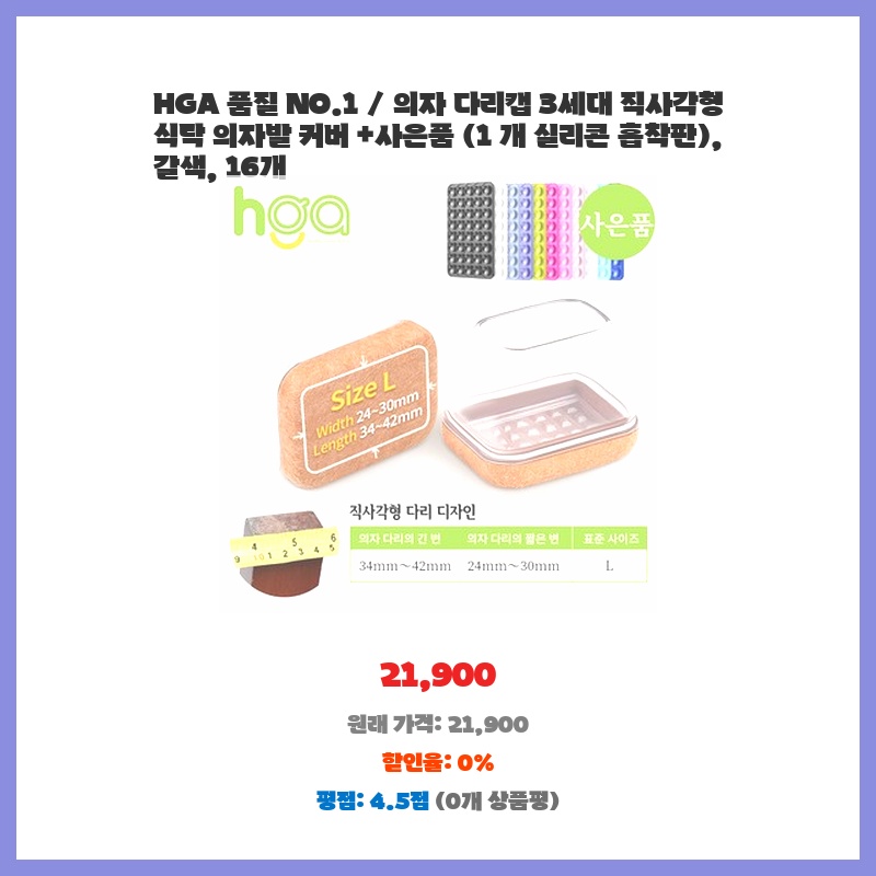 기존 의자 다리 때문에 바닥이 망가지는 게 걱정되어 구매했습니다. 16개 세트에 사은품까지 있어 가성비가 좋았고, 직사각형 디자인이라 우리집 식탁 의자에 딱 맞을 것 같아 선택했습니다. HGA 품질이라 믿음직스러웠습니다.
