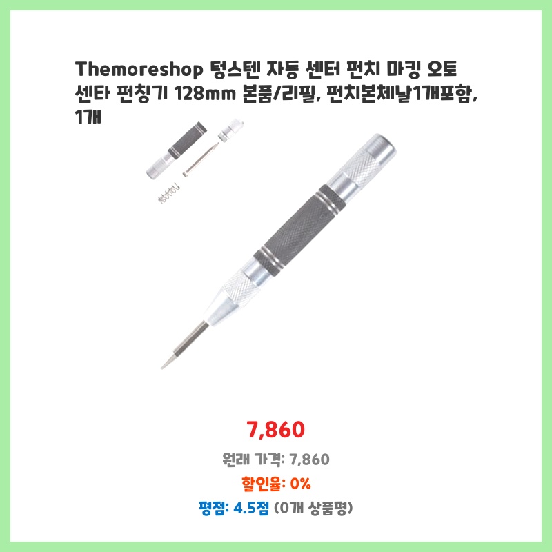 정확한 센터 펀칭이 필요해서 구매했습니다. 자동 기능으로 편리하고, 128mm 길이로 작업 효율이 높아졌습니다. 리필 날도 포함되어 있어 경제적입니다. 튼튼한 텅스텐 재질이라 오래 사용할 수 있을 것 같습니다.