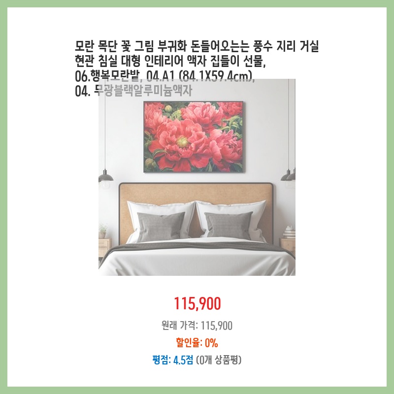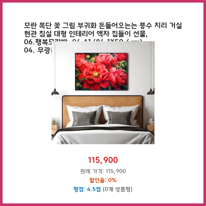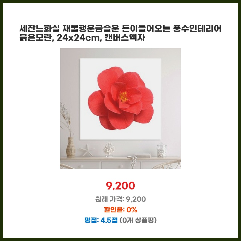 집들이 선물로 풍수 인테리어 소품을 찾던 중, 붉은 모란 그림이 마음에 들어 구매했습니다. 가격도 부담 없고, 캔버스 액자라 관리도 편할 것 같아 선택했습니다. 24x24cm 사이즈도 적당한 크기였습니다.