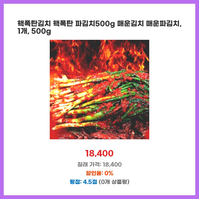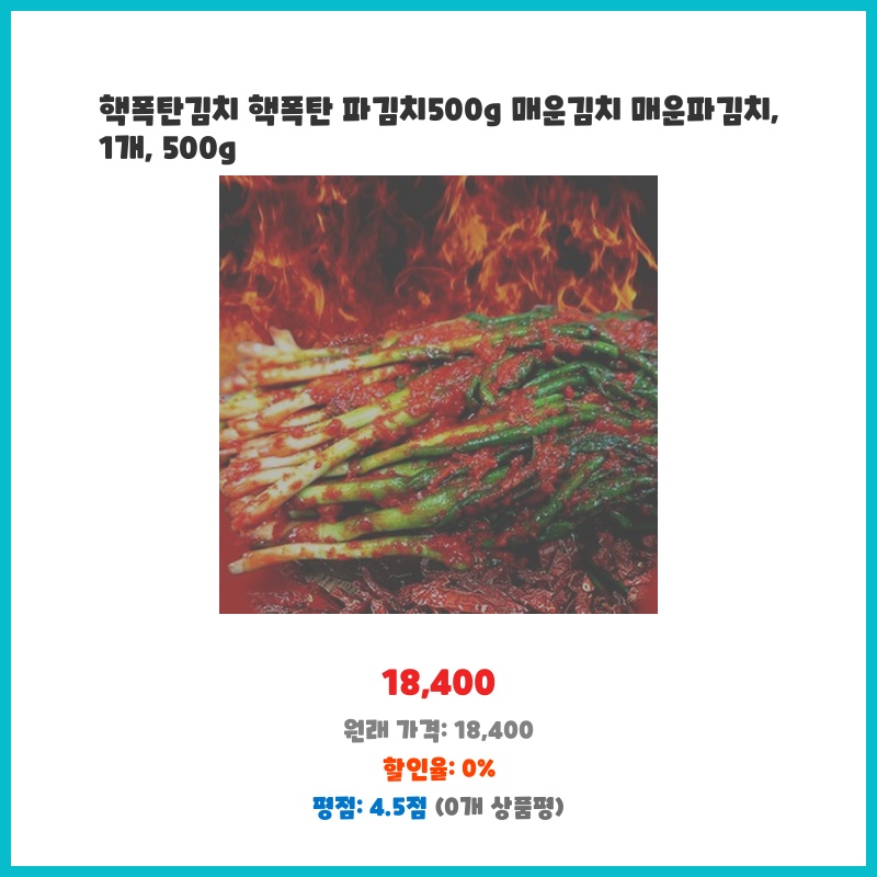 깔끔한 파김치를 선호하는데, 핵폭탄김치는 맵기 조절이 가능하고 500g 용량으로 넉넉하게 먹을 수 있어 구매했습니다. 파의 신선함이 느껴지고, 다른 김치와 비교해 덜 짜다는 점이 좋았습니다.