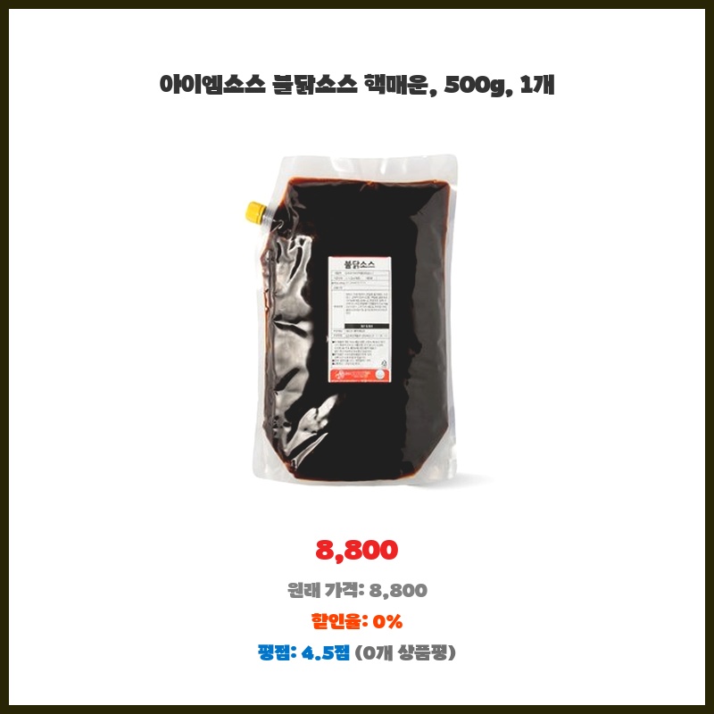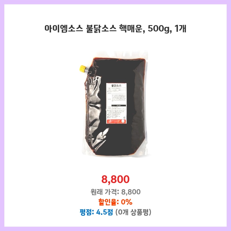 500g 대용량에 핵매운맛이라 닭갈비, 찜닭 등 다양한 요리에 활용하기 좋을 것 같아 구매했습니다. 아이엠소스 브랜드에 대한 신뢰도도 있었습니다. 매운맛을 좋아하는 저에게 적합할 것 같았습니다.