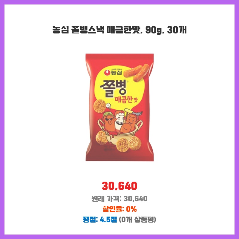 아이들이 쫄병스낵을 좋아해서 대량으로 구매했습니다. 90g 개별 포장이라 휴대하기 편하고, 매콤한 맛이 아이들 간식으로 적당합니다. 30개들이라 한동안 간식 걱정 없어 좋습니다.