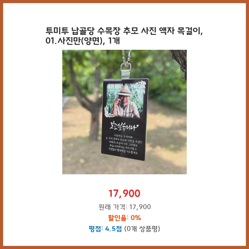 부모님 수목장 후, 언제 어디서든 편하게 추모할 수 있는 방법을 찾던 중 발견했습니다. 사진 액자 목걸이라 휴대성이 좋고, 양면에 사진을 넣을 수 있어 더욱 만족스럽습니다. 깔끔한 디자인도 마음에 듭니다.
