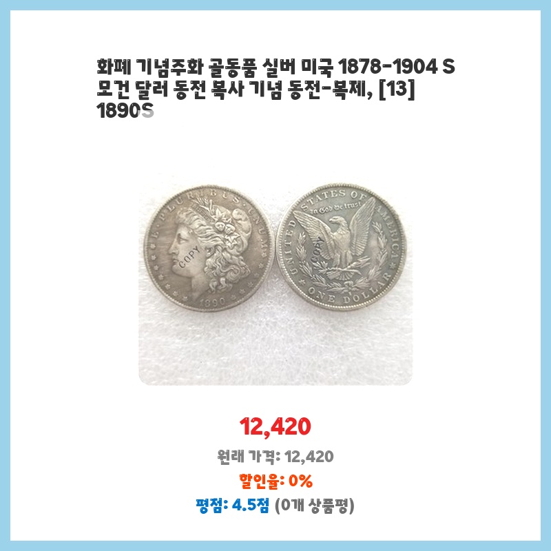 1890년대 모건 달러의 복제품이라 역사적 가치와 소장 가치가 높다고 판단했습니다. 실버 재질의 고급스러운 외관과 섬세한 디테일이 마음에 들었습니다. 합리적인 가격에 만족합니다.