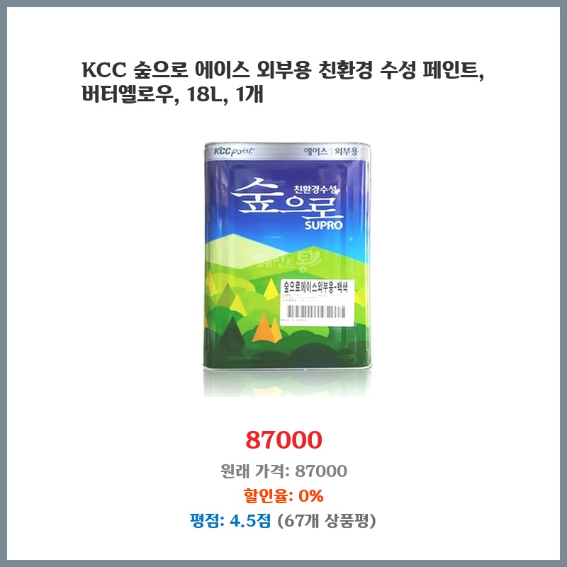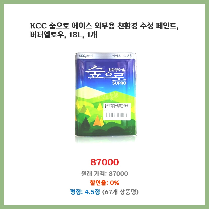 친환경 수성 페인트라 아이들과 함께하는 집 외벽에 안심하고 사용할 수 있어 선택했습니다. 18L 대용량으로 가격 대비 효율적이고, 버터옐로우 색상이 밝고 산뜻한 느낌을 줄 것 같아 기대됩니다. KCC 제품이라 믿음직스러웠습니다.