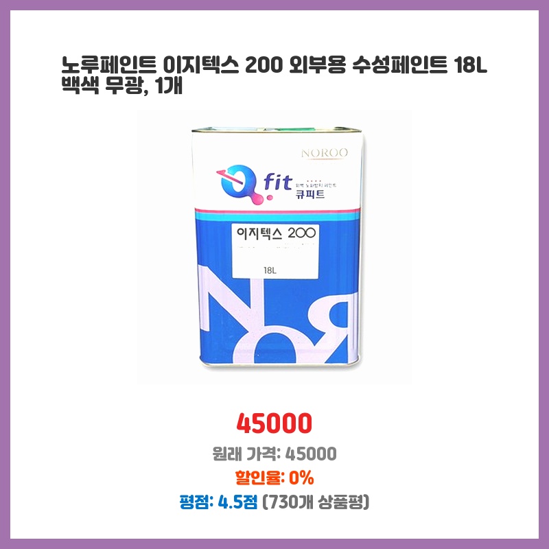 외부 벽면 페인트칠을 해야 했는데, 노루페인트 이지텍스200의 우수한 내구성과 수성이라 친환경적인 점이 마음에 들었습니다. 18L 대용량으로 작업 효율도 높일 수 있을 것 같아 구매했습니다. 백색이라 깔끔하고 어떤 색상과도 잘 어울릴 것 같았습니다.