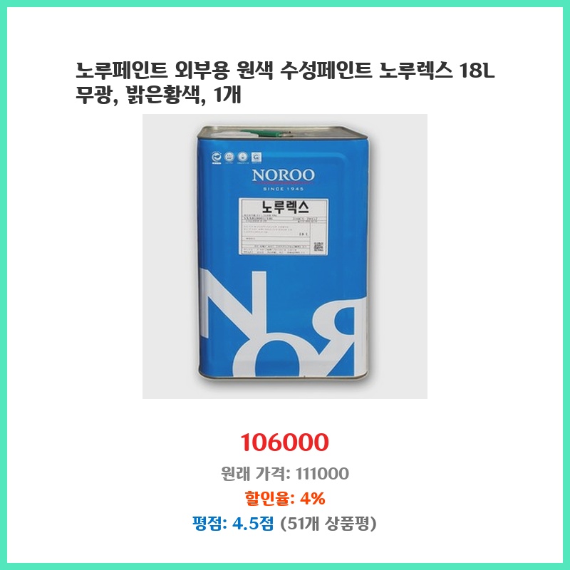 외부 벽면 페인트칠을 계획 중이었는데, 노루페인트의 품질과 18L 대용량이 작업 효율을 높여줄 것 같아 선택했습니다. 무광 밝은황색은 생각했던 색상과 가까워 만족스러웠습니다. 수성페인트라 작업도 편리할 것으로 예상됩니다.